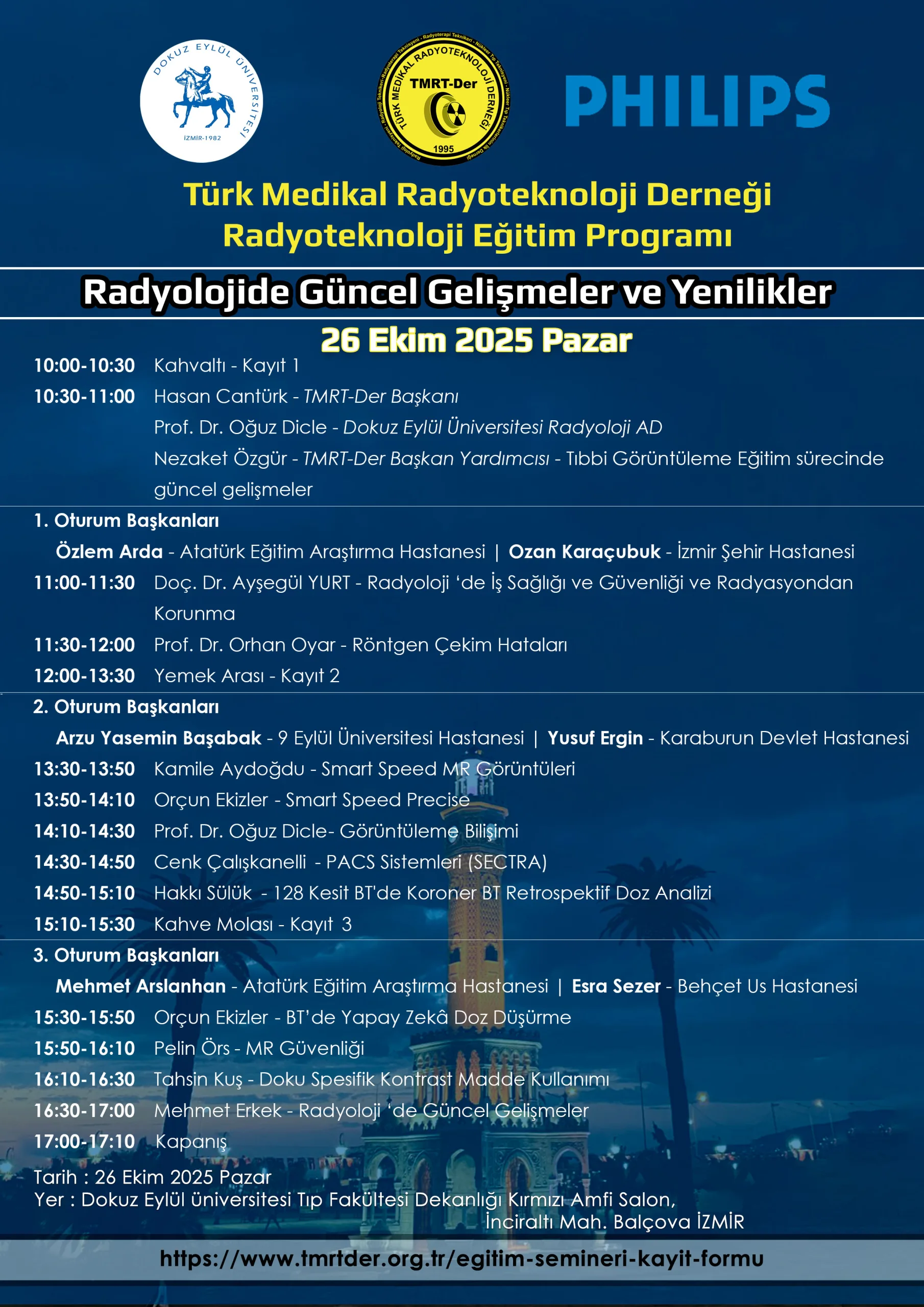 26 Ekim 2025 Pazar günü Dokuz Eylül üniversitesi Tıp Fakültesi Dekanlığı Kırmızı Amfi salonda Radyolojide Güncel Gelişmeler ve Yenilikler konularının paylaşılacağı ücretsiz eğitim programımıza davet ediyoruz.